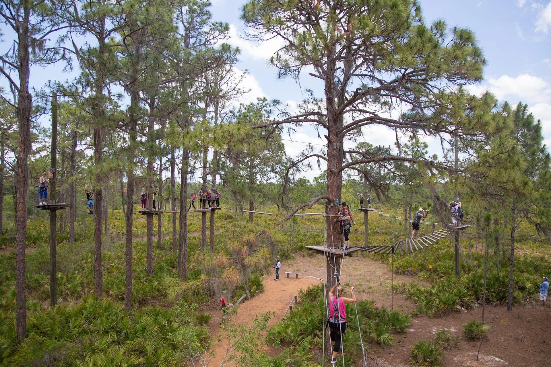This is for learning how to tackle the treetops if the last time you climbed a tree was to get your cat out of it. This course is minimally elevated and is set beneath a canopy of Live Oak and Pine forest. Games include several footbridges, a little swing challenge, a V net walkway and a low speed zip line. This is the perfect way to ease into the tougher stuff and it will give you the confidence boost to get out there and show those trees what you're made of!